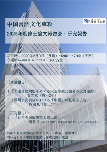 | 発表者 | 〈修論報告〉 1「大連金建問題をめぐる大連華商公議会の反対運動」黄亢亢(修士2年) 2「満州事変前後における『申報』の化粧品広告」 呉逸楓(修士2年) 〈研究報告〉 3「日本の民俗研究と風土論」鄧桃香(中山大学D3、非文字資料研究センター研究協力者) |